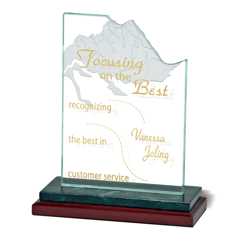 Sculpted Jade glass award with green marble and cherry finished wood. Available in three sizes.