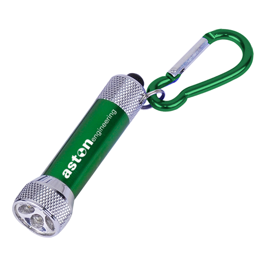 5 White LED bulb flashlight with 1-1/2" carabiner key chain. Push the bottom switch to turn on flashlight. Four LR44 cell type batteries included with white insulation chip (Please remove before use). Prices include one color, one location imprint. Colors Available: Black, Blue, Green and Red.