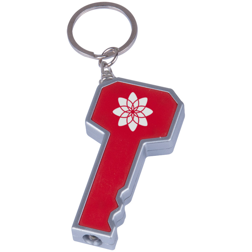 Key shape Key Chain with single bulb LED flashlight. Push center switch to turn on light. Cell type batteries included. Prices include one color, one location imprint. Available Colors: Black, Blue, Green, and Red.