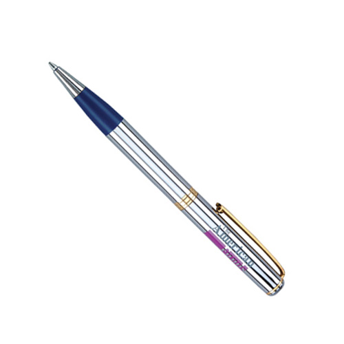 Twist action ballpoint. Solid brass barrel in polished chrome finish with colored grip. Available Colors: Matte Blue, Matte Black.