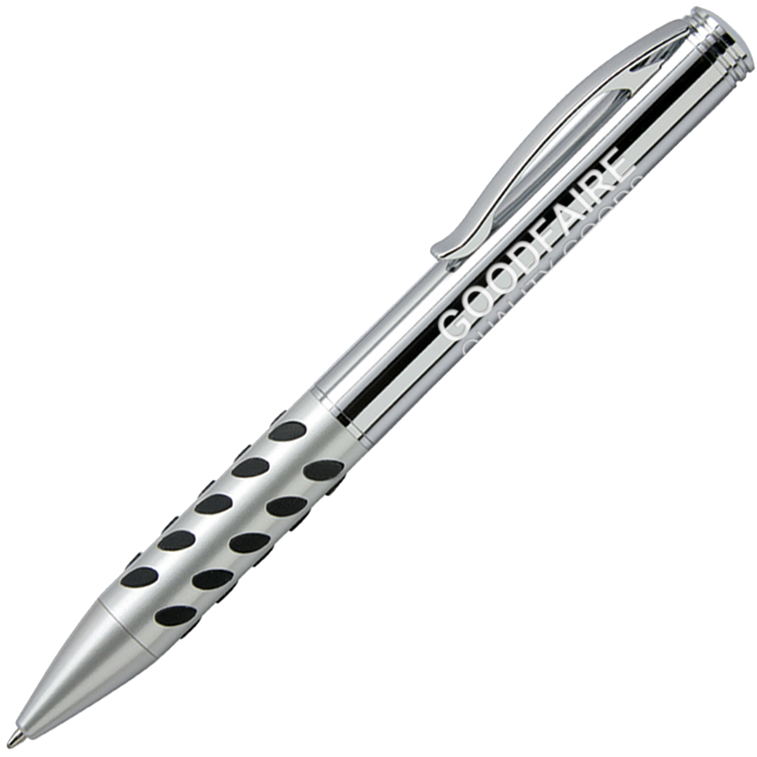 Twist action ballpoint (GV-110B) or Cap off roller ball (GV-110R). Solid brass construction. Metallic color cap and matte silver barrel with colorful protruding rubber grip.